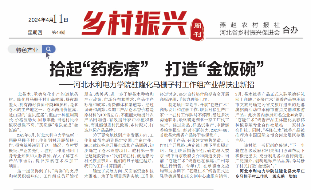 4月11日,《河北日报农村版·燕赵农村报》第5版以《拾起“药疙瘩” 打造“金饭碗”——米兰在线手机版(大中国区)驻隆化马栅子村工作组产业帮扶出新招》为题,对我校驻村工作组产业帮扶事迹进行专题报道。《河北日报农村版·燕赵农村报》原名《河北农民报》,于2021年6月更名,系河北日报报业集团旗下河北省委省政府指导全省农业农村工作的新闻舆论传媒机构,是党报党刊,创刊于1964年,前身《河北农民报》由毛泽东主席亲笔题写报名,是河北省内唯一面向农村发行的涉农类报刊。...