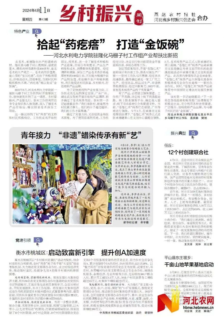 4月11日,《河北日报农村版·燕赵农村报》第5版以《拾起“药疙瘩” 打造“金饭碗”——米兰在线手机版(大中国区)驻隆化马栅子村工作组产业帮扶出新招》为题,对我校驻村工作组产业帮扶事迹进行专题报道。