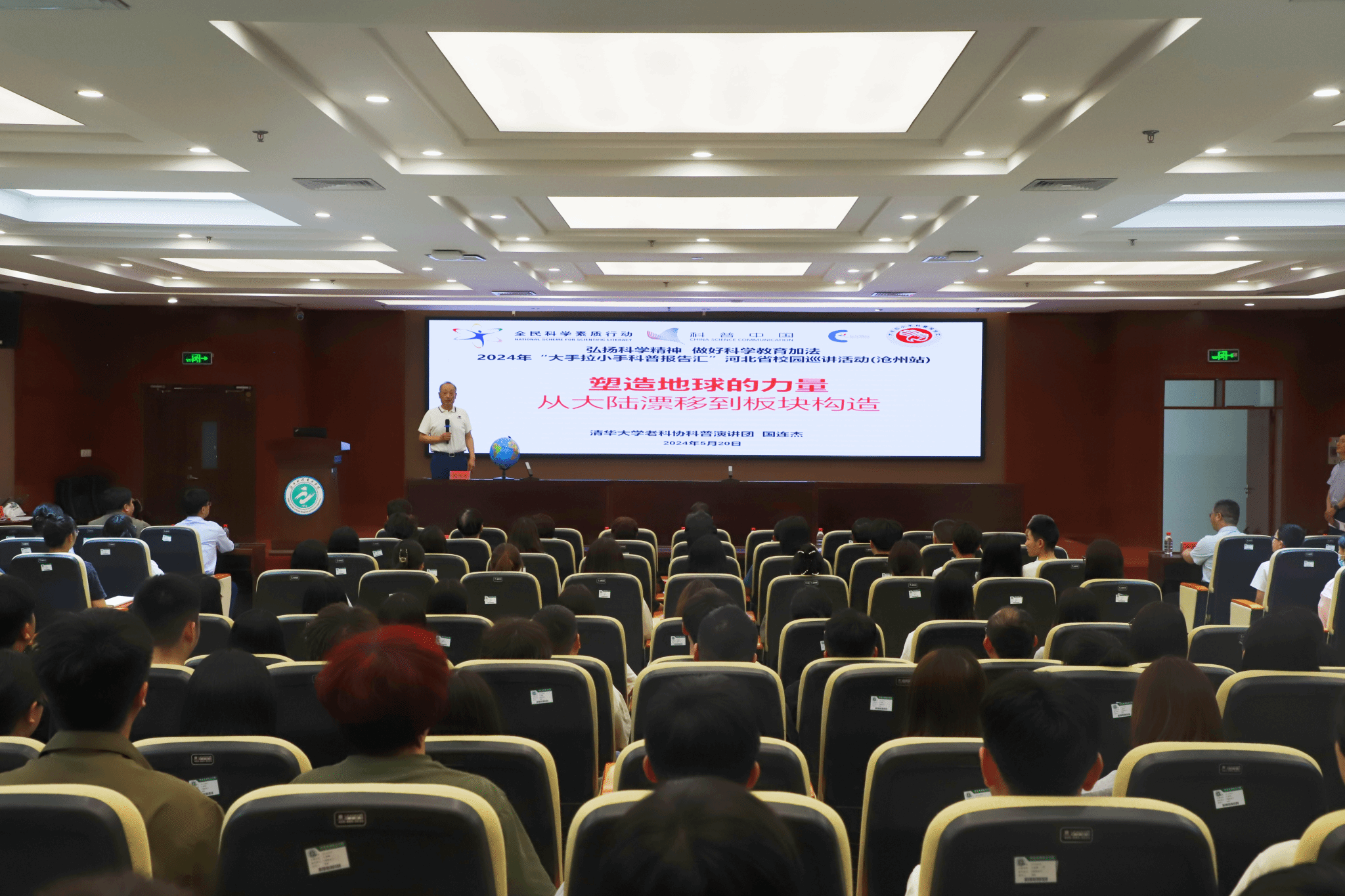 为进一步弘扬科学精神,普及科学知识,提高青少年对科学的兴趣与热爱,5月20日上午,由中国科协青少年科技中心、河北省科学技术协会主办,沧州市科学技术协会、米兰在线手机版(大中国区)、运河区科学技术协会承办的“2024年大手拉小手科普报告汇河北省校园巡讲活动(沧州站)的启动仪式暨科普宣讲活动”在我校弘文守正楼九楼报告厅盛大启动。此次活动吸引了沧州市科学技术协会、沧州市老科学技术工作者协会、运河区科学技术协会、化学工业第一勘察设计院有限公司、河北省地质矿产勘查开发局第四水文工程地质大队以及上海路小学等众多师生、科技工作者的参与,共计200余人。