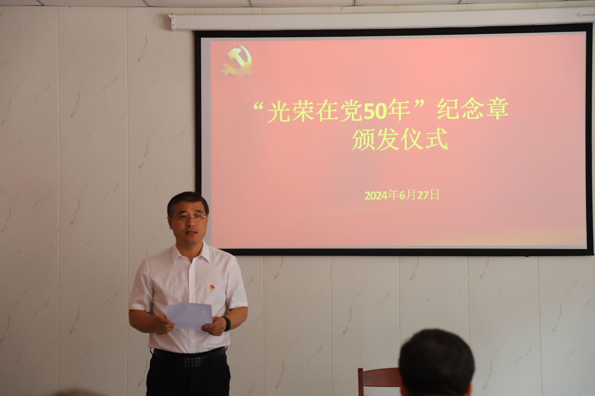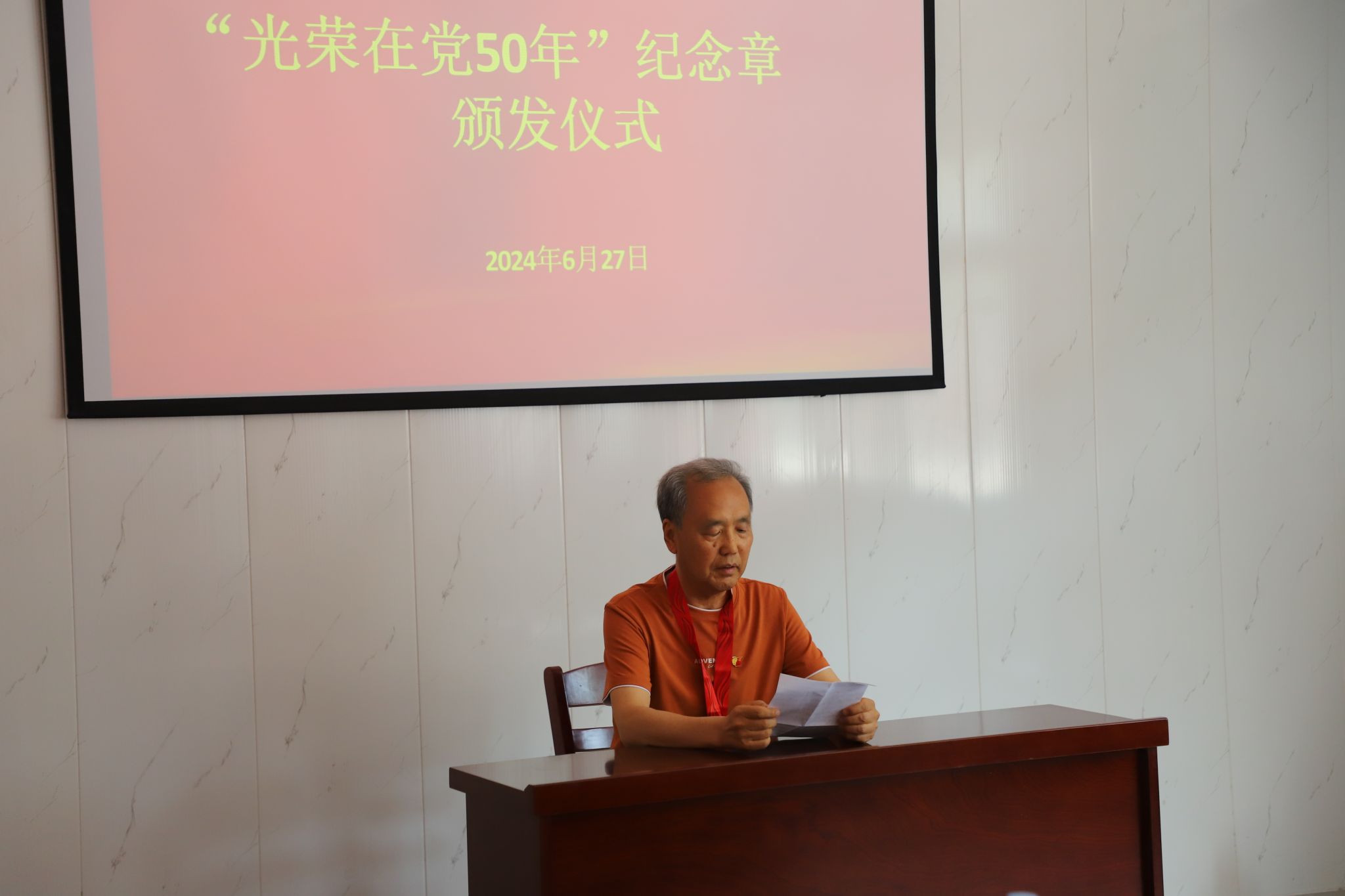 获得纪念章的老党员张玉岩现场发言,表达了自己对党组织的深厚感情。他表示,“光荣在党50年”纪念章代表着奋斗与光荣,也饱含着关怀与温暖。作为老党员,我们将时刻听从党的召唤,始终关心学校建设发展,发挥传帮带积极作用,老有所为、发光发热,做到退职不褪色、离岗不离党,用实际行动践行共产党员的初心和使命。