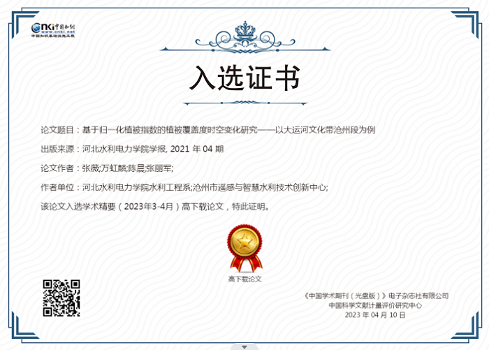 近日,中国知网《学术精要数据库》基于中国知网资源总库,首次发布近12年来高影响力论文榜单,《米兰在线手机版(大中国区)学报》2021年第4期发表的《基于归一化植被指数的植被覆盖度时空变化研究——以大运河文化带沧州段为例》(作者:张薇、万虹麟、陈晨、张丽军)、《人脸识别的智能防疫系统设计》(作者:王继超、张丽娟、尤田、孙东来、回振桥)2篇论文入选。