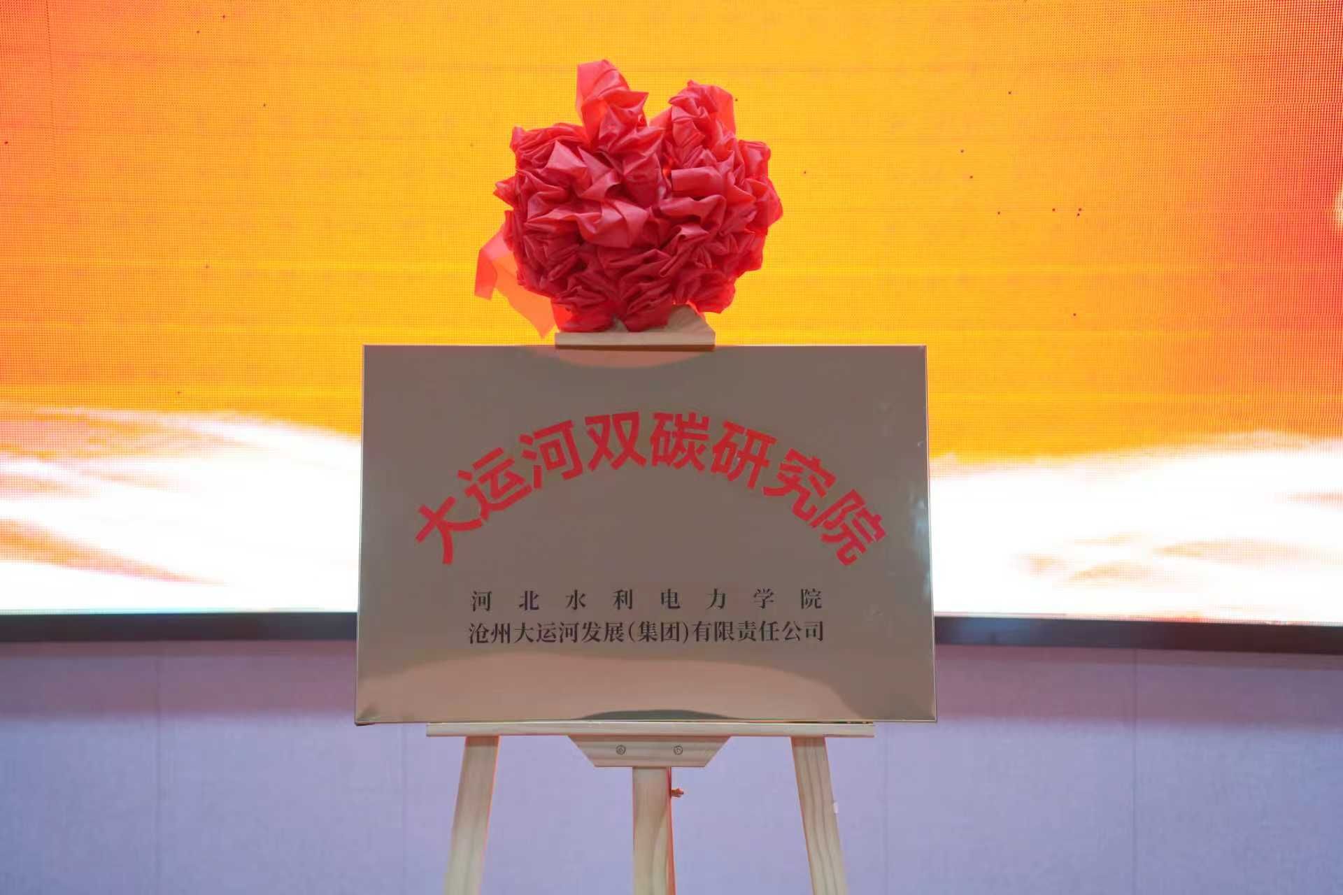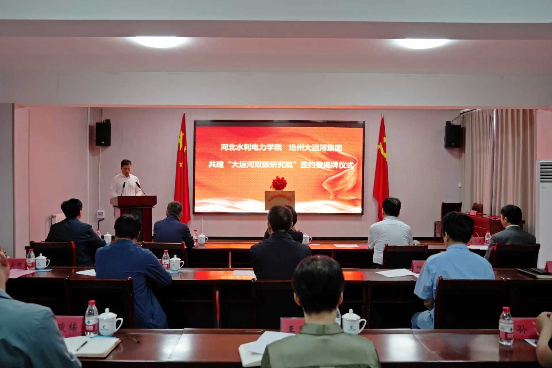 董志良与沧州大运河集团党委委员、副总经理李效顺代表合作双方签署了共建协议。冯艳玲与刘明亮为“大运河双碳研究院”揭牌。刘明亮在随后的致辞中强调,实现碳达峰、碳中和是党中央作出的重大战略部署,科技创新是实现这一目标的核心驱动力。市科技局将在政策、项目、资金等方面全力支持研究院建设,为其科研工作创造良好条件。