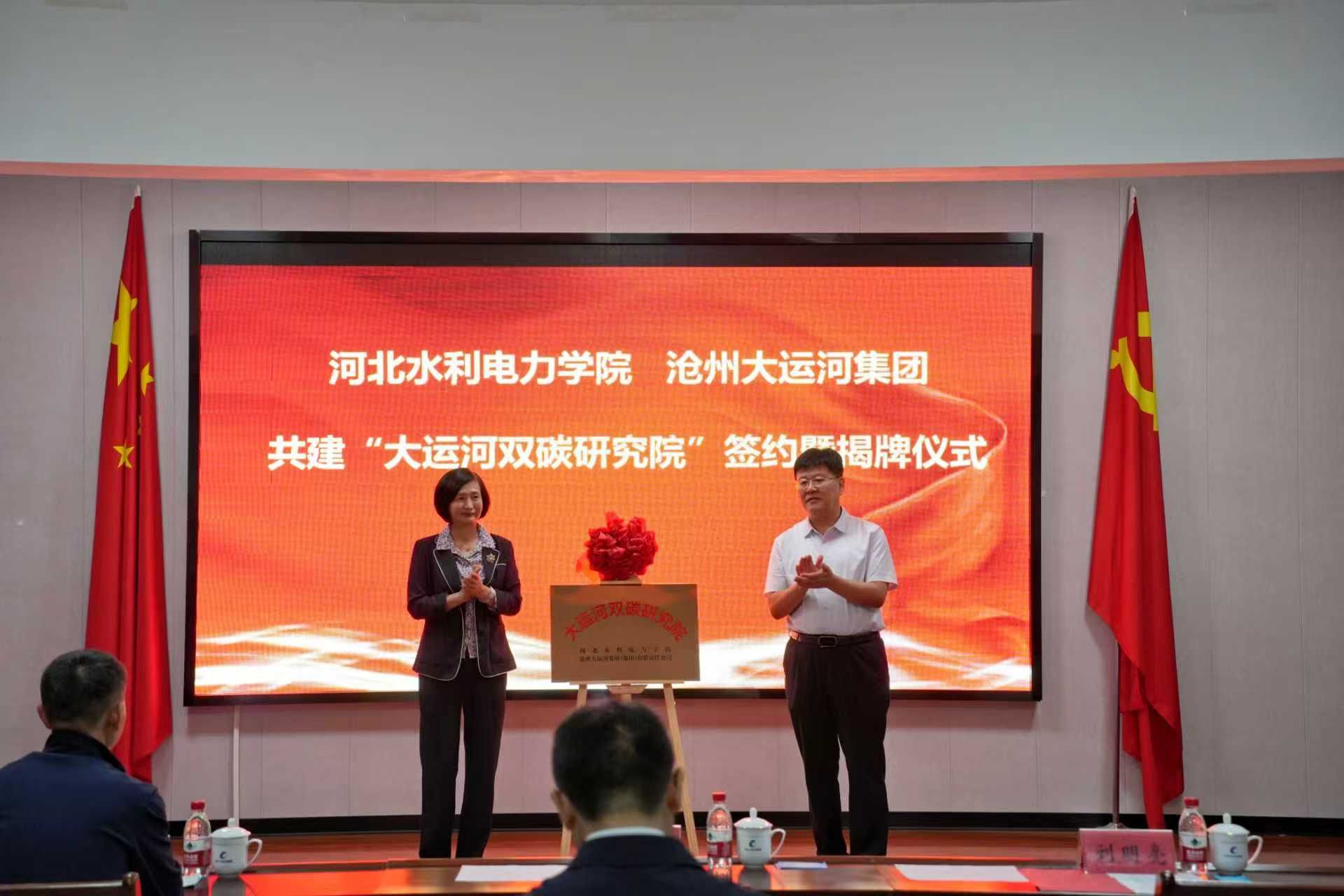 9月26日上午,由我校与沧州大运河集团携手共建的“大运河双碳研究院”在沧州大运河发展(集团)有限责任公司正式揭牌成立,标志着沧州市在深入落实国家“双碳”战略、推动绿色科技创新方面迈出关键一步。成立大会暨签约揭牌仪式由沧州大运河集团党委副书记、总经理王金楼主持。沧州市国资委党委书记、主任冯艳玲,沧州市科技局党组书记刘明亮,沧州大运河集团党委书记、董事长李宗兆,我校党委副书记、校长王滨,党委副书记崔立功,副校长董志良等领导嘉宾共同出席见证。