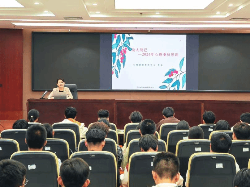 为加强班级心理委员队伍建设,提升心理委员的胜任力水平,增强学生的自助、互助意识与能力,10月24日下午,学生心理健康教育中心在弘文守正楼9楼报告厅举办了“助人助己——2024年心理委员培训”活动,本次培训由学生心理健康教育中心主任李立讲授,各系心理委员近200人参加培训。