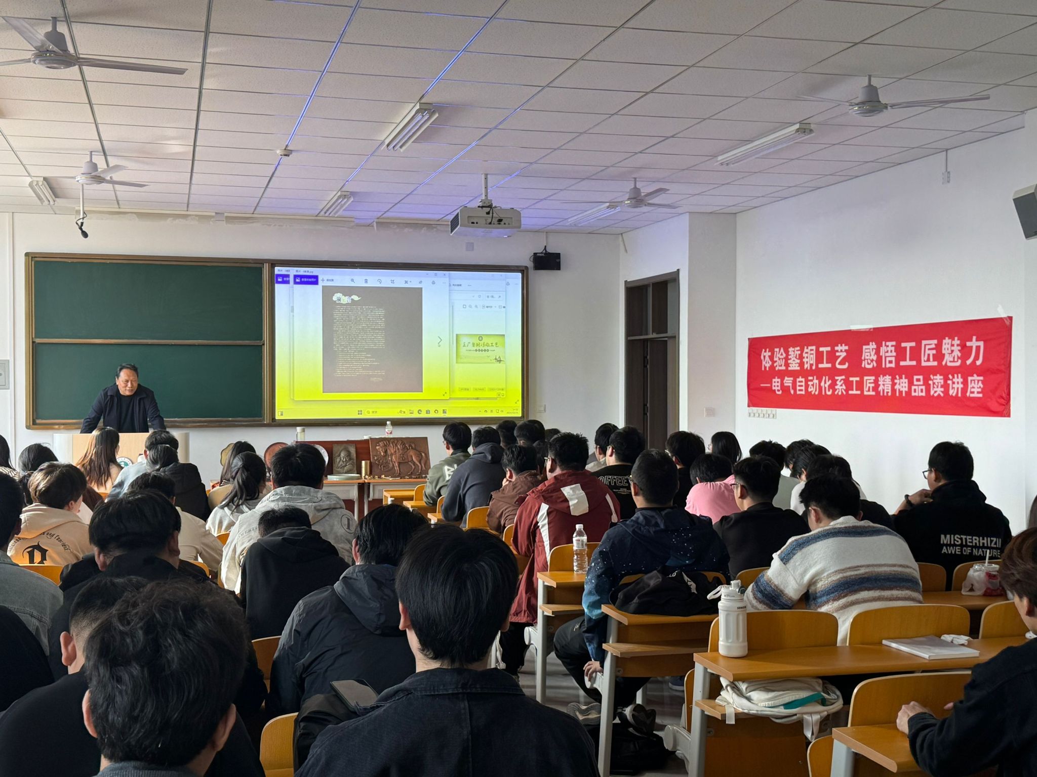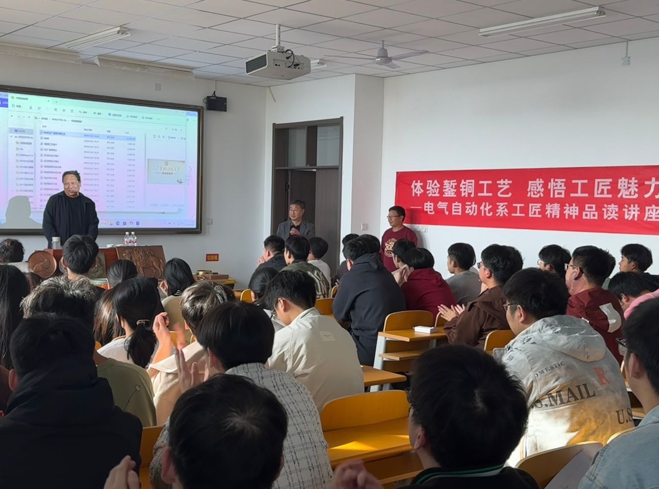 为弘扬工匠精神,提升青年大学生的审美能力和对中华传统工艺的认识,涵养情操,10月25日下午,电气自动化系邀请河北省级非遗“王厂錾铜浮雕”工艺项目第四代传承人、沧州市工艺美术协会会长王春周教授进行“体验錾铜工艺,感悟工匠魅力”工匠精神品读讲座。