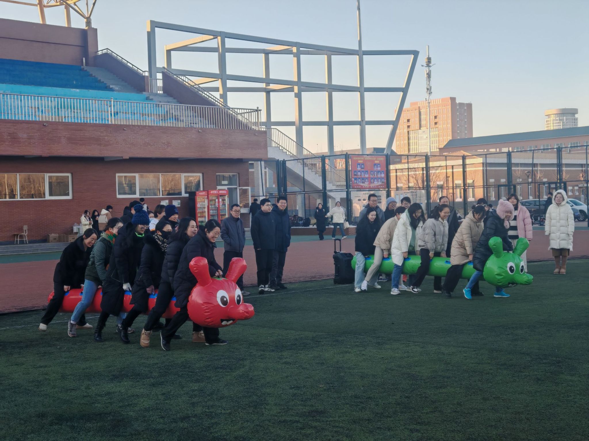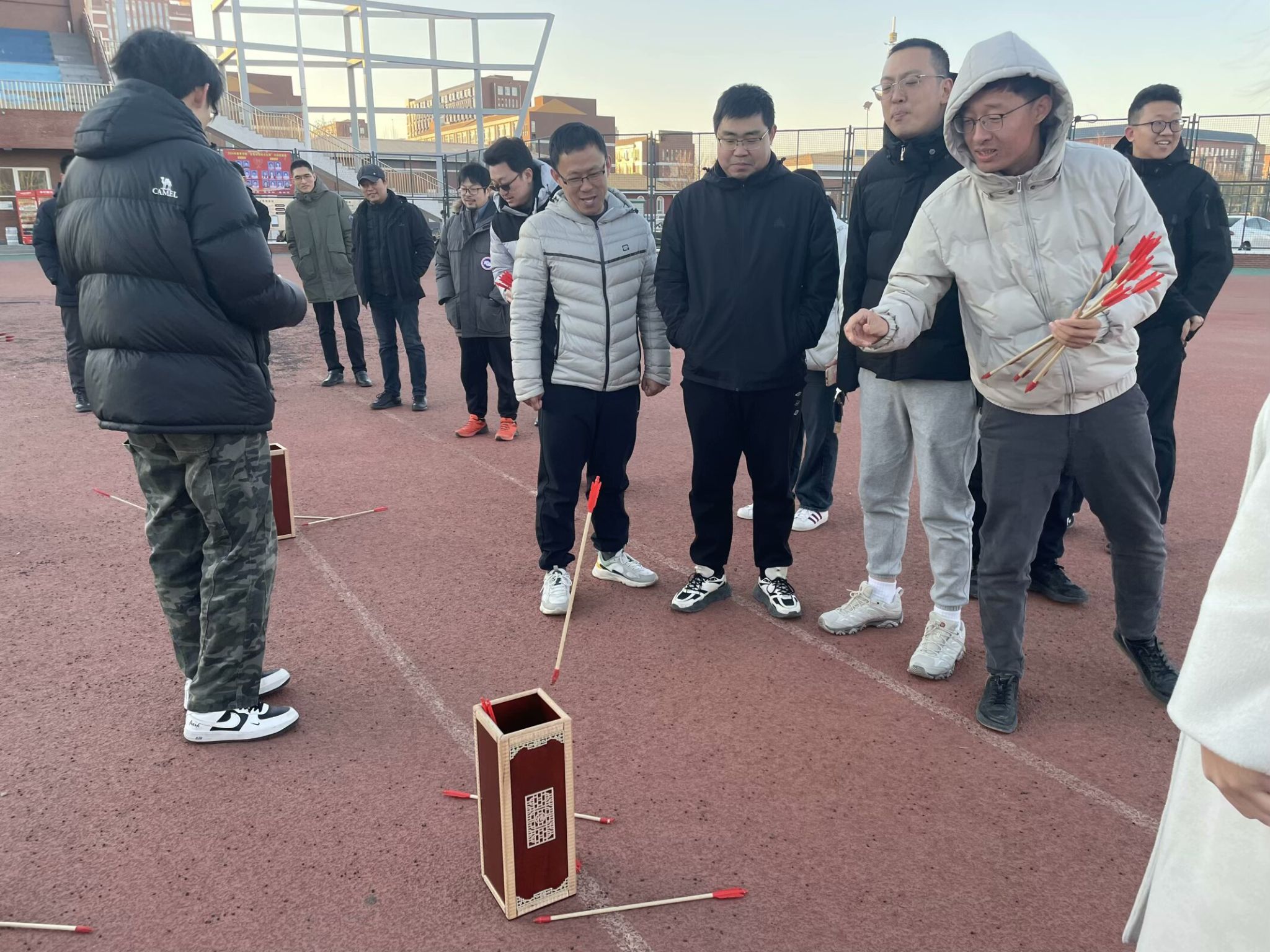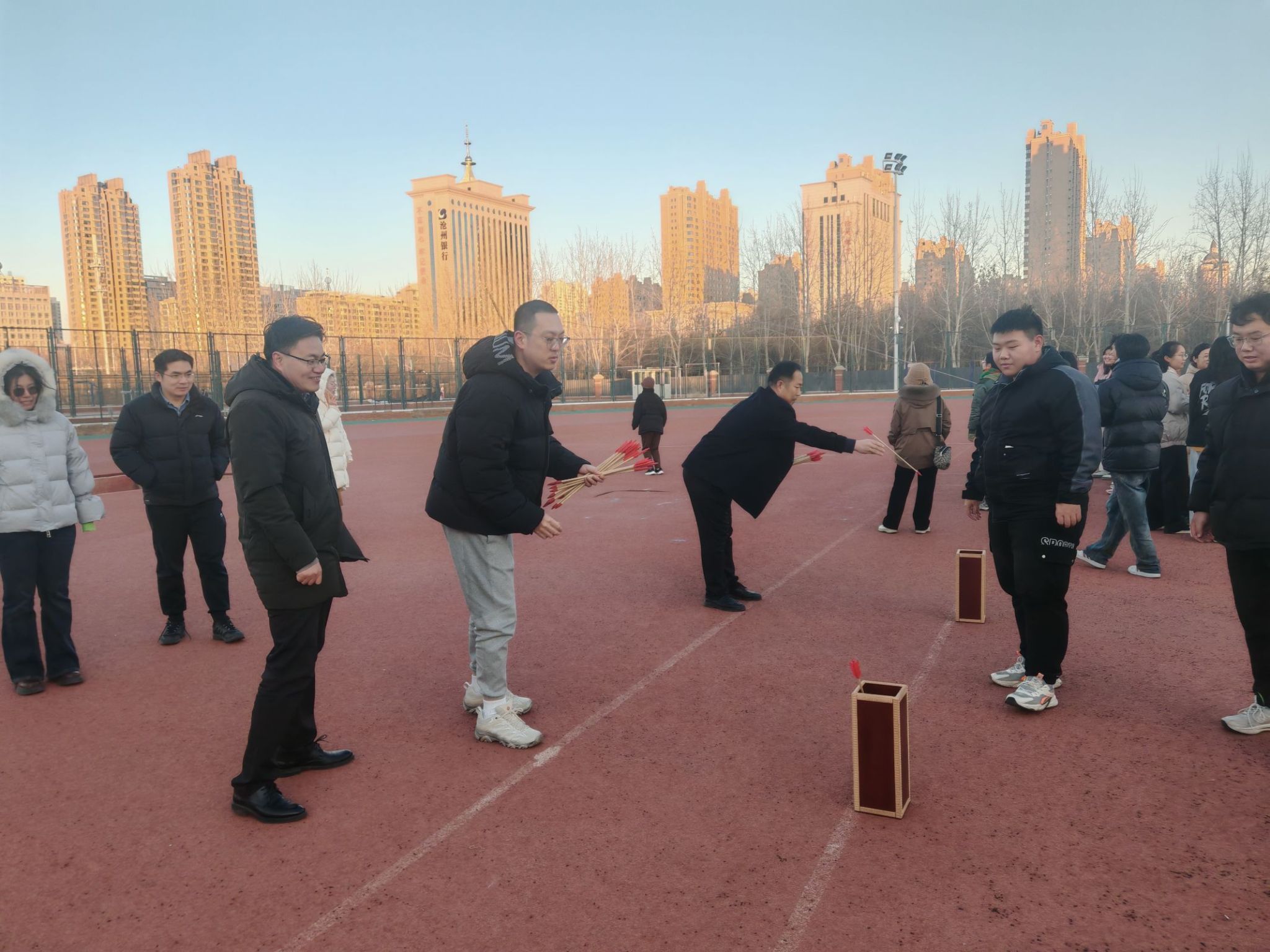 活动当天,阳光明媚,学生志愿者早早地布置好各类运动器材和道具。本次活动,六大趣味项目同时展开,“同心传杆”考验默契,老师们紧握长杆稳步挪移;“疯狂毛毛虫”里,大家骑坐道具,齐步向前,笑声不断;“两人三足”时,搭档们携手奔跑,步伐或踉跄或矫健;传统项目“投壶”,投出的箭矢带着专注与巧劲;五彩毽子上下翻飞,跳绳在空中舞出弧线。活动过程中,充满了欢声笑语,老师们在体育场上全情投入,尽情享受运动带来的快乐,现场响起阵阵掌声和欢呼,现场气氛热烈而融洽。