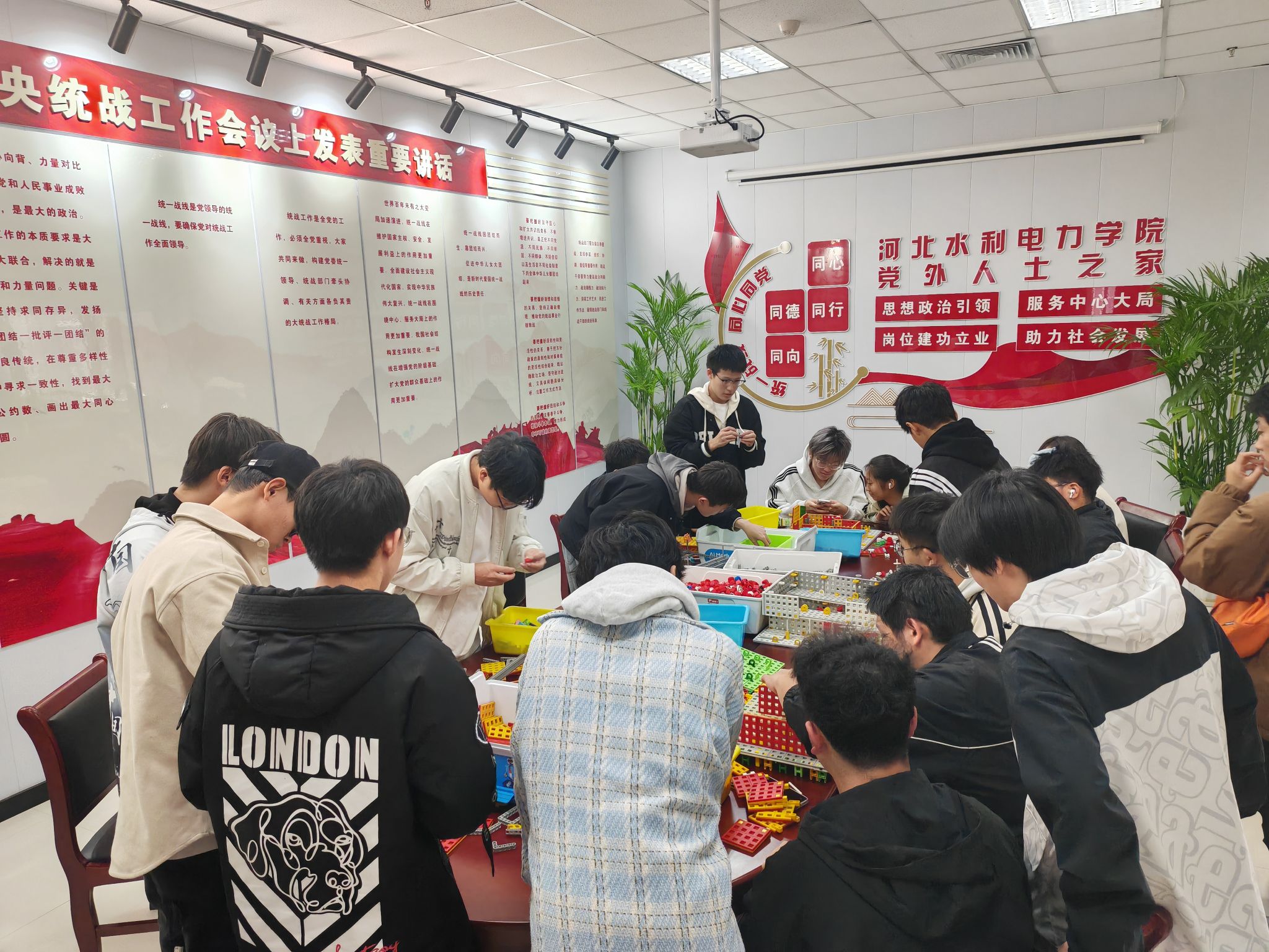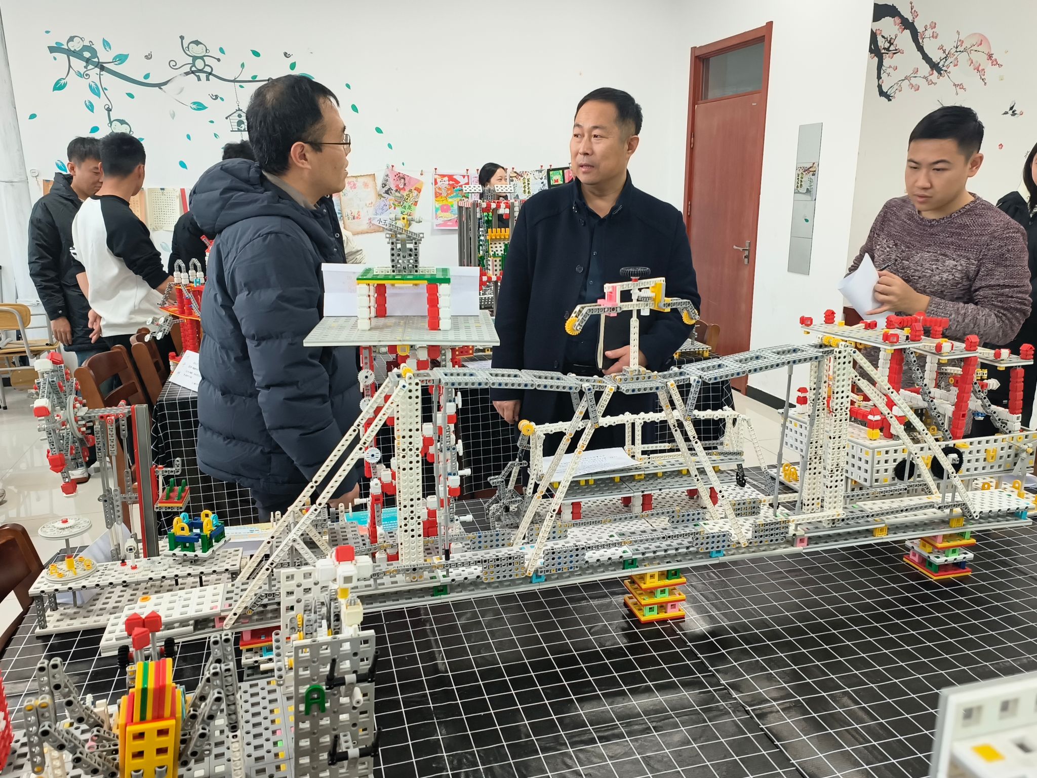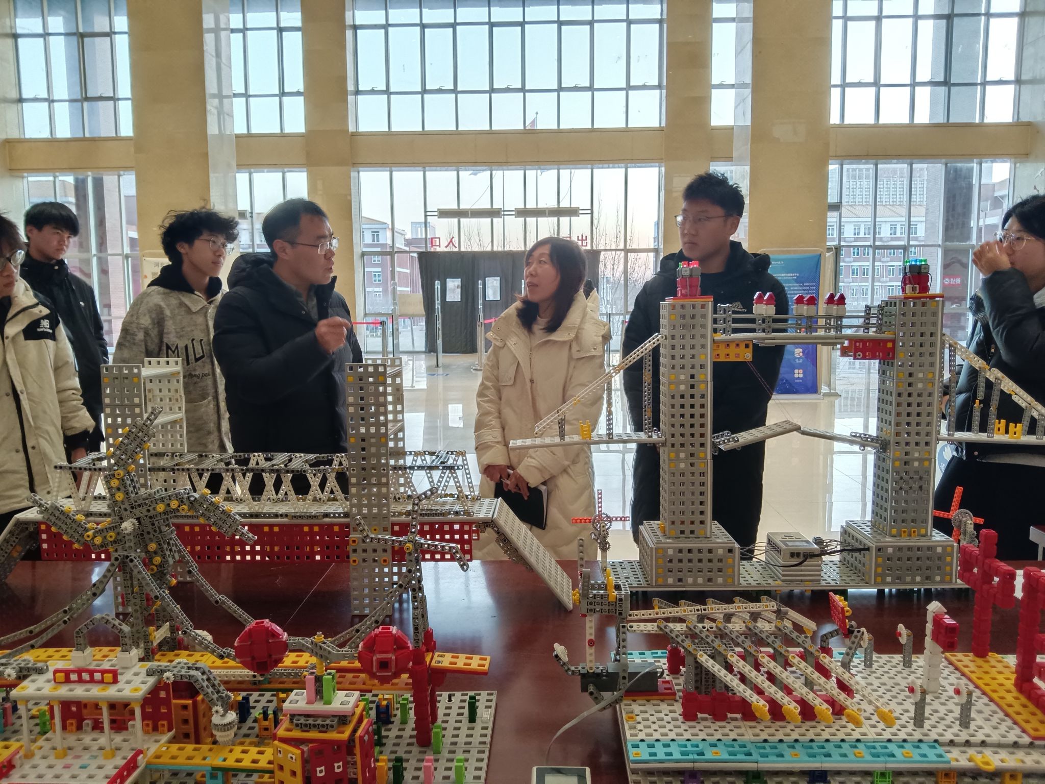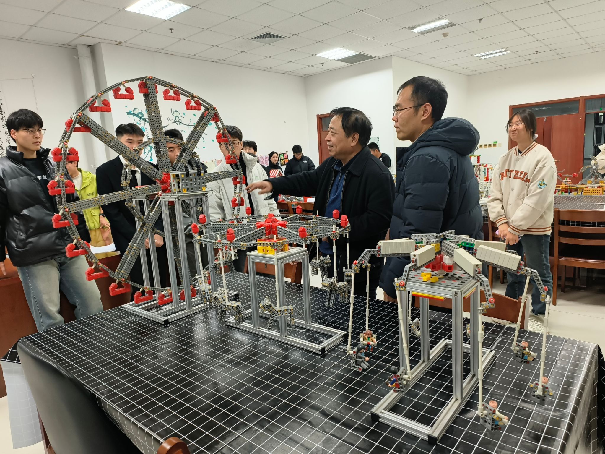 系列活动分别为建筑积木搭建比赛、智能车编程比赛、机械积木创意设计比赛,由各系学生组成团队报名参加,我校大学生创新创业社团指导教师、图书馆教师、民革成员张源老师具体组织并指导,场地依托图书馆二楼“党外人士之家活动室”打造创新社团活动室—“创新空间”,土木工程系党委书记王诚杰、图书馆馆长陈恩增、机械工程系副主任石岩博士、教学督导组李桐栋、电气自动化系团委书记张宁以及王浩、李瑞雪等相关单位领导老师多次来到现场观赛,听取学生们的创意思路并进行交流点评。