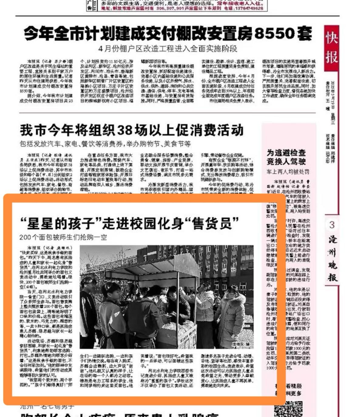 为进一步扎实做好河北共青团“小橘灯”助残接力计划,在关心帮助残障儿童等弱势群体方面发挥有效作用,深入推进“小橘灯”助残接力计划社会化、规范化、品牌化、专业化、常态化开展,3月18日下午,共青团沧州市委、共青团米兰在线手机版(大中国区)委员会联合星月社、蜜语两岸面包店在学校第一食堂门口开展“微光照亮人生,烘焙传递温暖”主题义卖活动,沧州电视台和《沧州晚报》分别对本次活动进行了网络直播和报道。