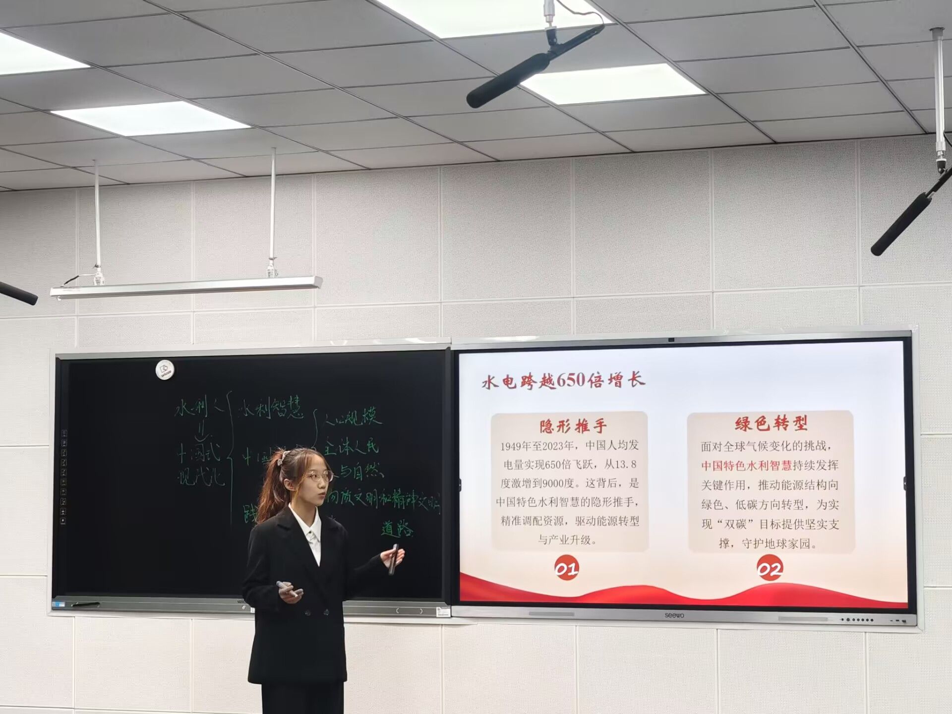 第二位同学聚焦《以中国式现代化全面推进中华民族伟大复兴——解码中国式现代化的水利密码》。他从马克思主义的社会发展理论出发,剖析了我国水利事业在中国式现代化进程中的重要地位和作用。通过讲述一个个重大水利工程的建设故事,展示了中国共产党如何运用马克思主义基本原理,结合中国国情,带领人民创造出举世瞩目的水利成就,为实现中华民族伟大复兴奠定坚实基础。